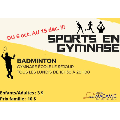 Joins-toi à nous pour des soirées de badminton tous les lundis, du 6 octobre au 15 décembre, au gymnase de l’école Le Séjour!