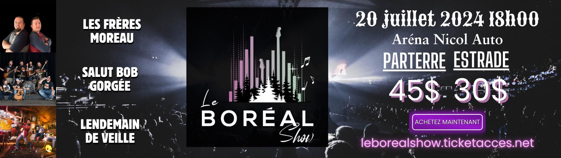 Le Boréale Show est un spectacle de musique annuel, rassemblant plusieurs artistes sous le même toit ! La totalité des profits amassés sera remise à la maison de soins palliatifs, Le Passage de l'Aurore. Présenté par JGR NAPA Pieces D'auto et le Chapitre 460 des Southern Cruisers Uniprix Claudia Denis - Pharmacie affiliée